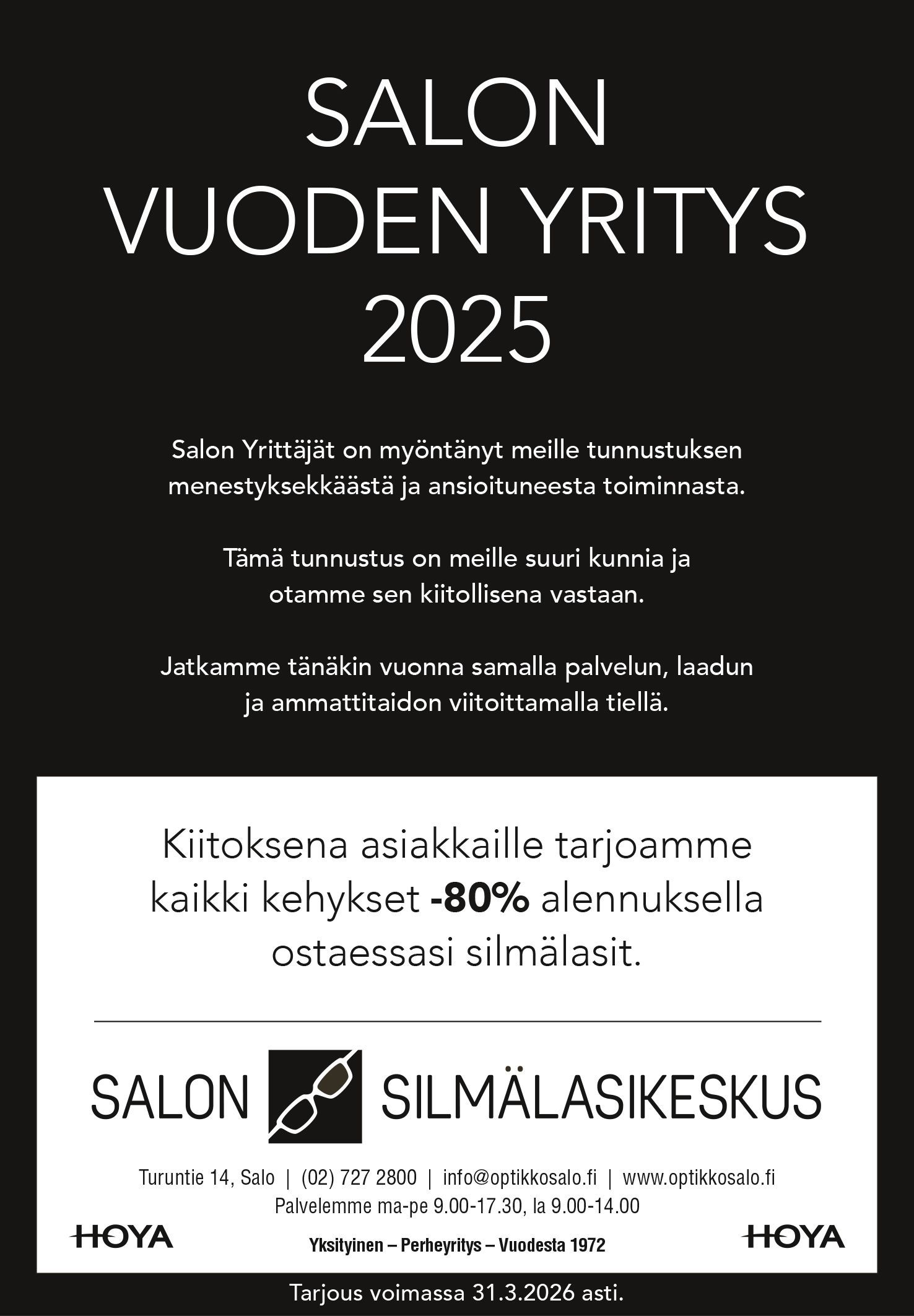 Kun haluat nähdä hyvin ja näyttää hyvältä niin tervetuloa meille! Salon Silmälasikeskus on Salon vanhin yksityinen optikkoliike. Perheyrityksemme on perustettu 1972 ja toimii edelleen yksityisesti saman perheen omistuksessa Salon ydinkeskustassa.